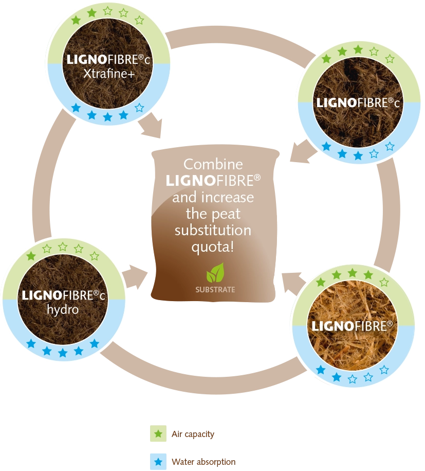 In this way, we cover the entire range from the press pot to the container and, in addition, the variants in combination also act as a so-called “peat replacement booster”, because well combined, the peat can be replaced in higher proportions and thus we significantly advance peat reduction while maintaining cultivation safety. This unique combinability of the wood fibre LIGNOFIBRE® is therefore the relevant point of leverage to continue to noticeably increase the peat replacement quota in the substrates with the raw materials currently available and thus to make them more climate-friendly.